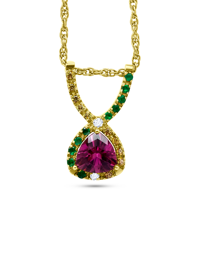 A luxury 18K rubellite pendant with sapphire, emerald, and diamond accents is a breathtaking piece of jewelry that combines the rich allure of precious gemstones with the elegance of high-quality gold.
